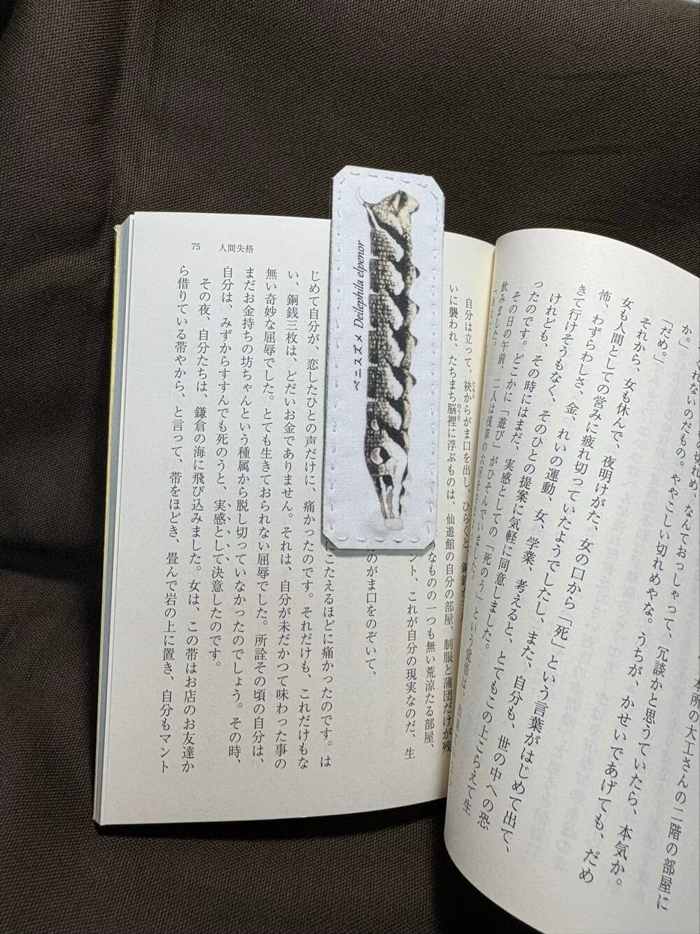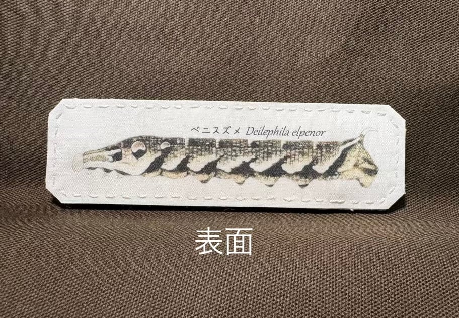 スズメガ幼虫の魅力を手元に感じる布製しおり/ベニスズメ