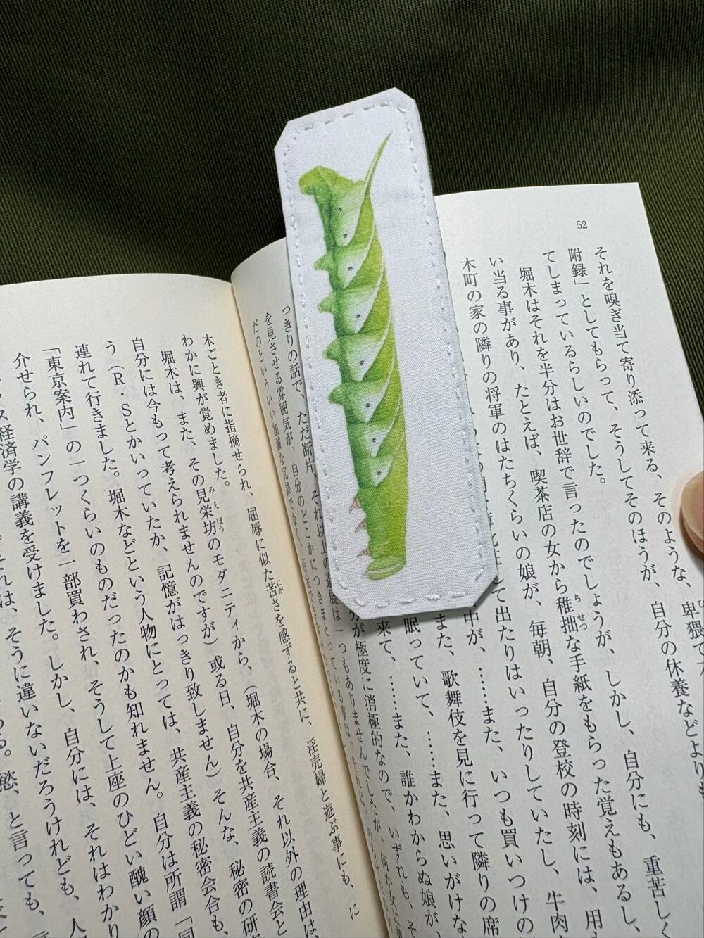 スズメガ幼虫の魅力を手元に感じる布製しおり/サザナミスズメ