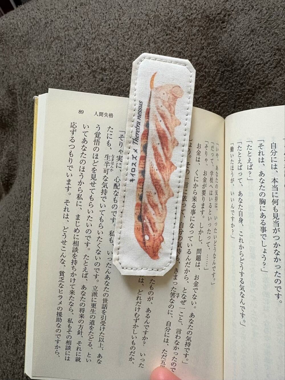スズメガ幼虫の魅力を手元に感じる布製しおり/キイロスズメ褐色型