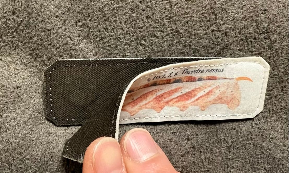 スズメガ幼虫の美しいイラストが概ね実物大でプリントされており、ページを挟んで留めるマグネット仕様が特徴のこの布製しおりは、使いやすさにもこだわりました。布製ですが適度なコシがあるため閉じた本のページの間に差し込むこともでき、マグネットで留まっているのでズレたり落ちたりしません。